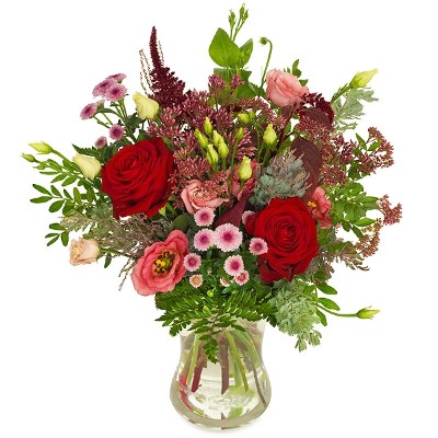Gemütlich, warm, eine heiße Schokolade schlürfend unter einer Decke. Genau dieses gemütliche Herbstgefühl wird mit diesem wunderschönen Strauß vermittelt. Kunstvoll komponiert aus Blüten wie Rosen, Eustomen, Santini und saisonalem Grün in den bezaubernden Farbtönen Dunkelrot, Rosa und sanften Brauntönen. Inspiriert von den Farben der Natur, strahlt dieser Strauß Wärme und Ruhe aus und erinnert an die heitere Atmosphäre eines Waldes im Herbst. Er eignet sich perfekt, um die einfachen Freuden des Lebens zu feiern oder herzliche Gefühle auszudrücken, und verspricht, jedem Anlass einen Hauch von rustikaler Eleganz zu verleihen. Mit seiner außergewöhnlichen, natürlichen Schönheit zu einem günstigen Preis wird dieser Strauß sowohl dem Schenkenden als auch dem Beschenkten viel Freude bereiten.